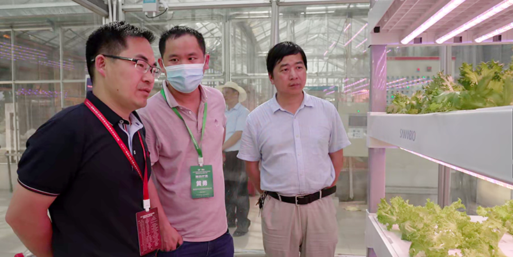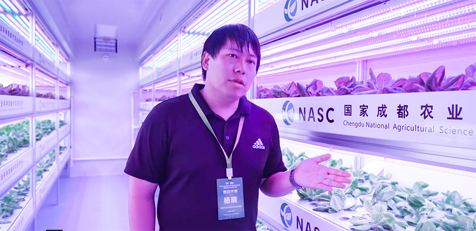 校友杨晓向参观人员介绍5G移动式智慧植物工厂
