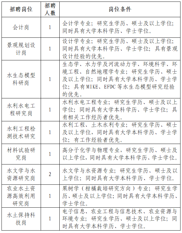 注:①年龄条件:35周岁以下(1987年1月1日以后出生);具有主持省部级以上科研项目或全省性水利相关规划、大中型水利工程前期工作及设计经验者(个人排名前2名),或具有水利及相关领域的高级职称或注册资质者,年龄可适当放宽至45周岁以下(1977年1月1日以后出生)。②若硕士毕业证上专业名称为大专业名称的,其研究方向可视为招聘专业。