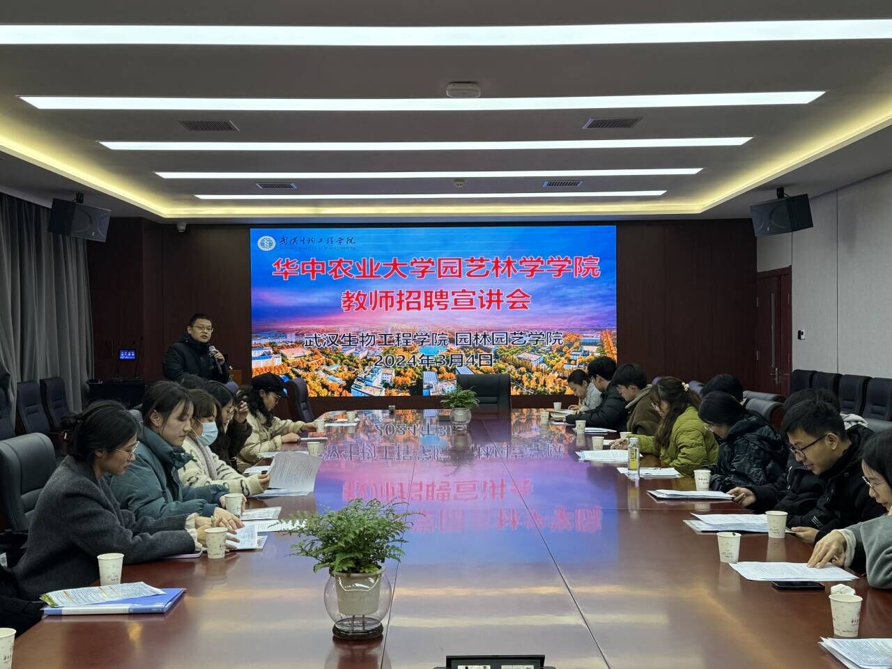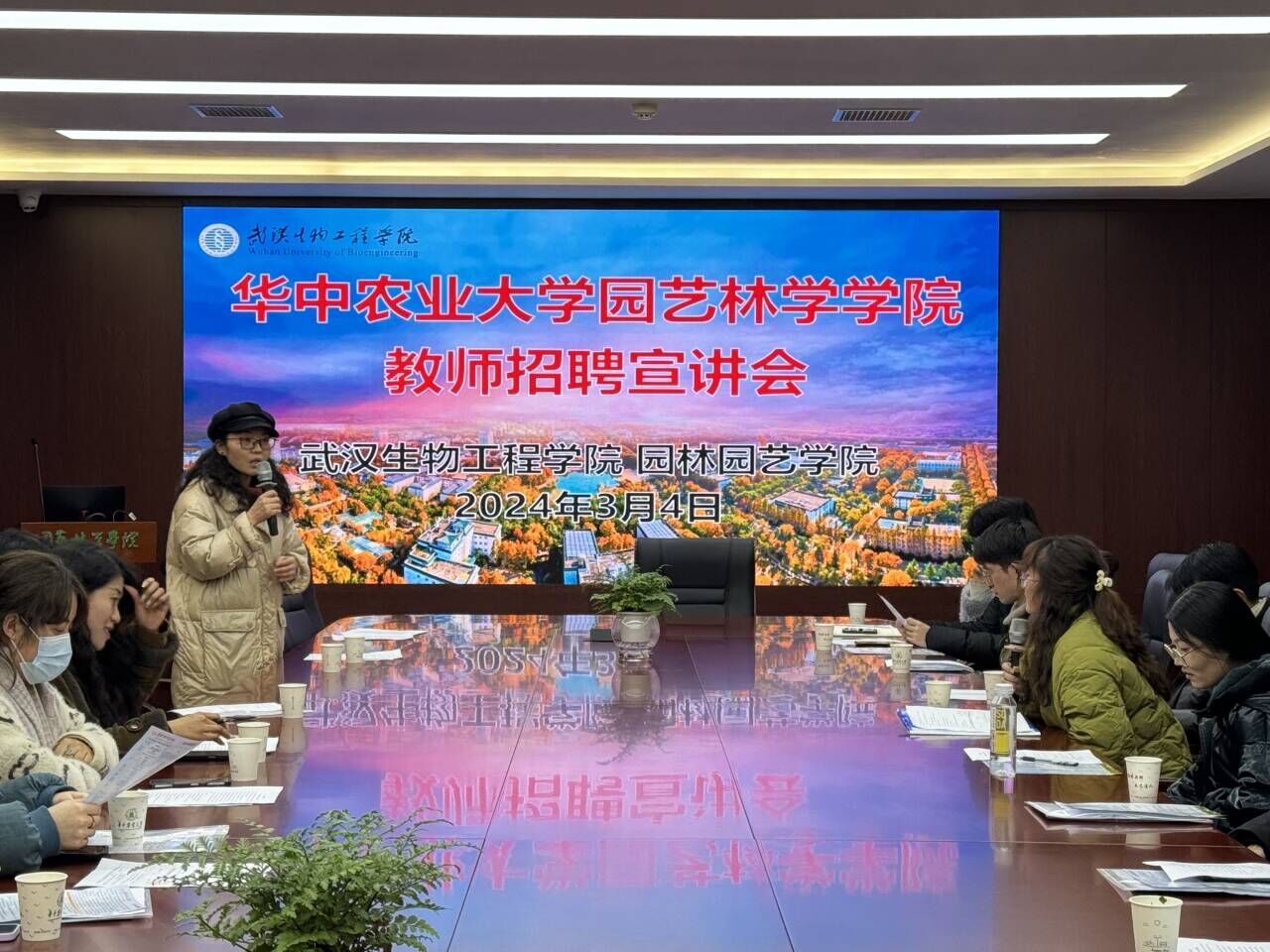 2024年3月4日下午,武汉生物工程八八看球 园林园艺八八看球 教师招聘宣讲会在八八看球 北楼219会议室举行。武汉生物工程八八看球 园林园艺八八看球 副院长唐艳平、园林园艺八八看球 党总支副书记张群慧、八八看球 研究生辅导员肖晗、孟悦及二十余名毕业年级博士、硕士生参加了宣讲会。