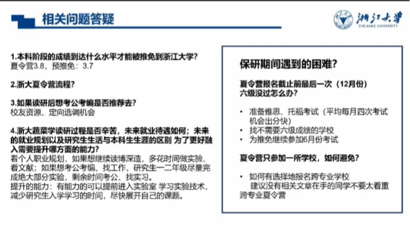 首先,保研至浙江大学蔬菜学专业的硕士研究生李太彬学长分享了读研经历与保研经验。李太彬学长对浙江大学、农业与生物技术八八看球 以及蔬菜研究所进行了介绍;针对学习经验,他主要强调了课上抓重点、课下做笔记的必要性;结合自身经验,他建议同学们关注八八看球 官网,做时间表并整理文件夹,在申请阶段,有选择地多投学校,并在结束面试后与感兴趣的老师保持联系;在面试技巧方面,他强调应深度梳理科研经历,充分掌握面试内容,做好应答准备;最后,他就推免成绩、夏令营流程及保研时遇到的困难等常见性问题进行了针对性解答。
