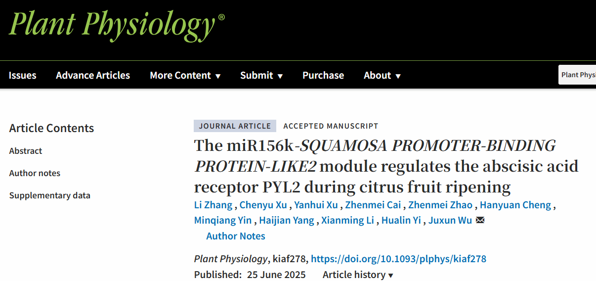 近日,华中农业大学果蔬园艺作物种质创新与利用全国重点实验室伊华林/吴巨勋课题组在Plant Physiology发表了 “The miR156k-SQUAMOSA PROMOTER-BINDING PROTEIN-LIKE2 module regulates the abscisic acid receptor PYL2 during citrus fruit ripening”的研究论文,揭示了csi-miR156k通过靶向SPL2促进柑橘果实成熟的功能和分子机制。