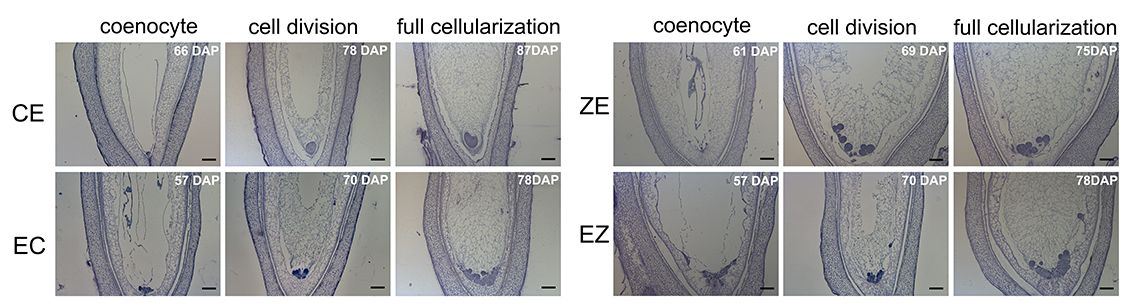 近日,八八看球-在线看球直播网站 、果蔬园艺作物种质创新与利用全国重点实验室郭文武教授团队在《The Plant Journal》发表了题为“Comprehensive analysis of imprinted genes in citrus endosperm and their contributions to seed development”的研究论文。该研究以两对正反杂交组合(克里曼丁橘 × 椪柑、椪柑 × 克里曼丁橘;早金甜橙 × 椪柑、椪柑 × 早金甜橙)的胚乳为材料,通过对其发育进程细胞学观察,确定了胚乳细胞化的关键发育时期(图1)。采用激光显微切割技术对不同发育时期和不同正反交组合的胚乳细胞进行精细取样并进行转录组测序分析,首次在柑橘中鉴定出296个印记基因(包含263个母本印记基因和33个父本印记基因);其中仅7.9%~20.5%其同源基因在拟南芥、水稻等植物中同样被鉴定为印记基因,表明印记基因在不同植物间的保守性相对有限。对其在柑橘不同组织的表达分析发现,父本印记基因更倾向于在胚乳中特异性表达,且不同发育阶段呈动态印记表达。