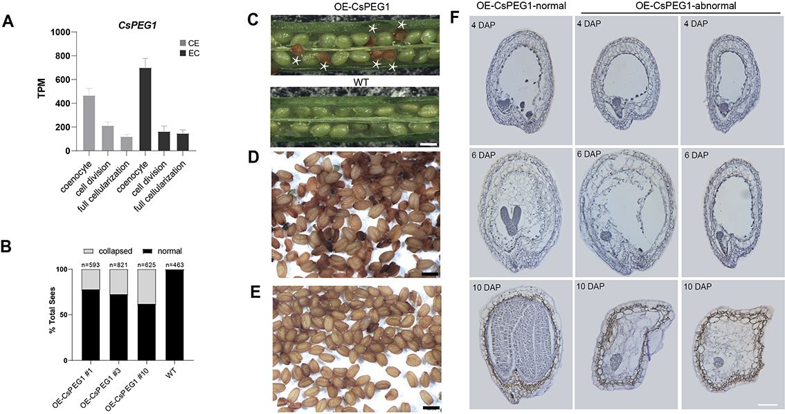 图2 CsPEG1过表达导致拟南芥种子败育与胚乳细胞化延迟