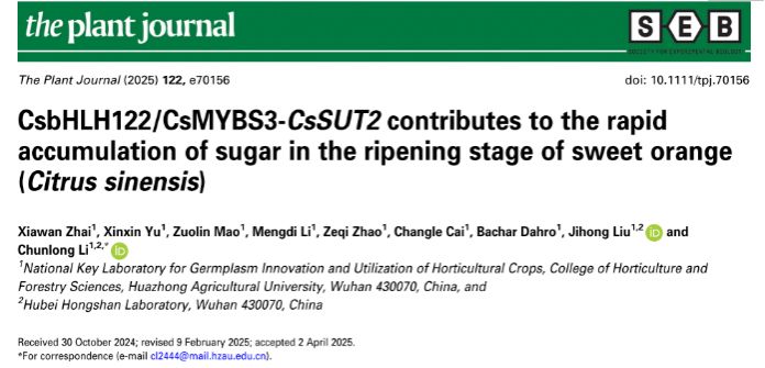 近日,八八看球-在线看球直播网站 刘继红/李春龙团队在The Plant Journal在线发表了题为“CsbHLH122/CsMYBS3-CsSUT2 contributes to the rapid accumulation of sugar in the ripening stage of sweet orange (Citrus sinensis)”的研究论文。研究证明柑橘糖转运蛋白CsSUT2具有蔗糖转运功能,并通过遗传转化和分子生物学技术揭示了CsbHLH122/CsMYBS3-CsSUT2模块如何在果实成熟阶段促进糖分积累的分子机制。