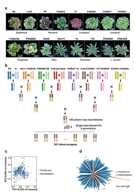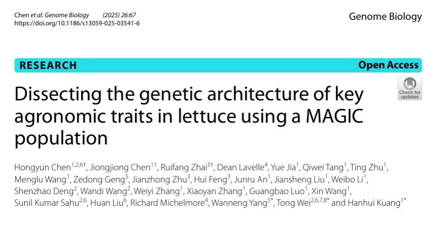 (通讯员 陈宏运)近日,八八看球-在线看球直播网站 、果蔬园艺作物种质创新与利用全国重点实验室匡汉晖教授团队,联合武汉华大生命科学研究院魏桐研究员团队和华中农业大学作物遗传改良全国重点实验室杨万能教授团队在《Genome Biology》杂志在线发表了题为“Dissecting the genetic architecture of key agronomic traits in lettuce using a MAGIC population”的研究论文。该研究通过构建全球首个生菜多亲本高世代互交群体(MAGIC),结合高通量表型组技术表征分析和GWAS系统解析了生菜叶色、开花时间和叶形等关键农艺性状的遗传调控网络,揭示了生菜独特农艺性状形成的分子机制,为生菜的设计育种奠定了遗传基础。