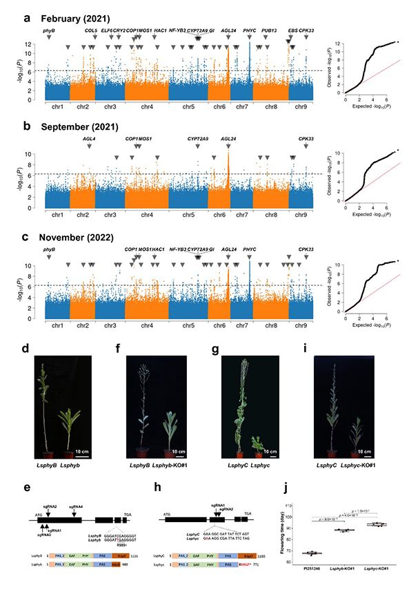 本研究通过GWAS鉴定到51个与开花时间显著关联的位点,根据序列变异、预测蛋白质功能以及候选区域中的eQTL,筛选鉴定并验证了部分候选基因。其中光敏色素基因LsphyB和LsphyC的功能缺失突变会显著延迟生菜开花时间,这与拟南芥等物种中光敏色素促进开花的经典模式截然相反。这一发现揭示了生菜在进化过程中形成的独特光周期响应机制,为培育耐抽薹品种提供了重要的基因资源(图3)。
