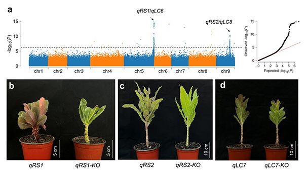 本研究基于HSI和RGB成像对叶色的GWAS鉴定了9个显著关联位点(qLC1-9),其中4个(qLC6-9)与生菜叶片颜色相关的已知基因共定位,qLC6、qLC7和qLC8分别编码bHLH、MYB和ANS蛋白,这些蛋白之前已被证明可以控制生菜的红叶和绿叶。qLC9 基因座与LsGLK基因重叠,后者是控制生菜叶片叶绿素浓度的主要QTL。其余5个位点(qLC1-5)是本研究中首次发现。同时,研究发现生菜红茎和红叶性状调控信号存在重叠,但不完全相同,表明生菜叶色调控的复杂性(图2)。