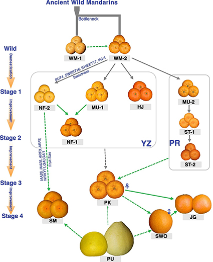 宽皮柑橘(Loose-skin mandarin,LSM)是橘和柑的统称,因其易于剥皮而受到消费者的青睐。中国作为世界第一柑橘生产国,在2022年,中国柑橘产量超过6000万吨,其中宽皮柑橘占总产量的71%,具有重要经济价值。在宽皮柑橘的驯化和改良过程中,柑橘果实糖酸和果实大小等关键性状发生了显著变化。在长期的柑橘驯化和育种过程中,这些性状是如何形成的?以及宽皮柑橘在中国的育种历史是怎样的?这些问题至今仍不清楚。解决这两个问题将有助于我们进一步改良现有的宽皮柑橘品种,从而更有效地选育出更优质的宽皮柑橘。然而,宽皮柑橘复杂的遗传背景,模糊的分类以及化石资源的缺乏限制了其起源和驯化历史的解析,进一步阻碍了潜在选择信号的识别。幸运的是,中国4000多年的柑橘栽培历史保存了很多古老柑橘品种,如南丰蜜橘、红橘、南橘、建柑和年橘等,这些品种将为进一步解开宽皮橘的驯化历史提供重要线索。
