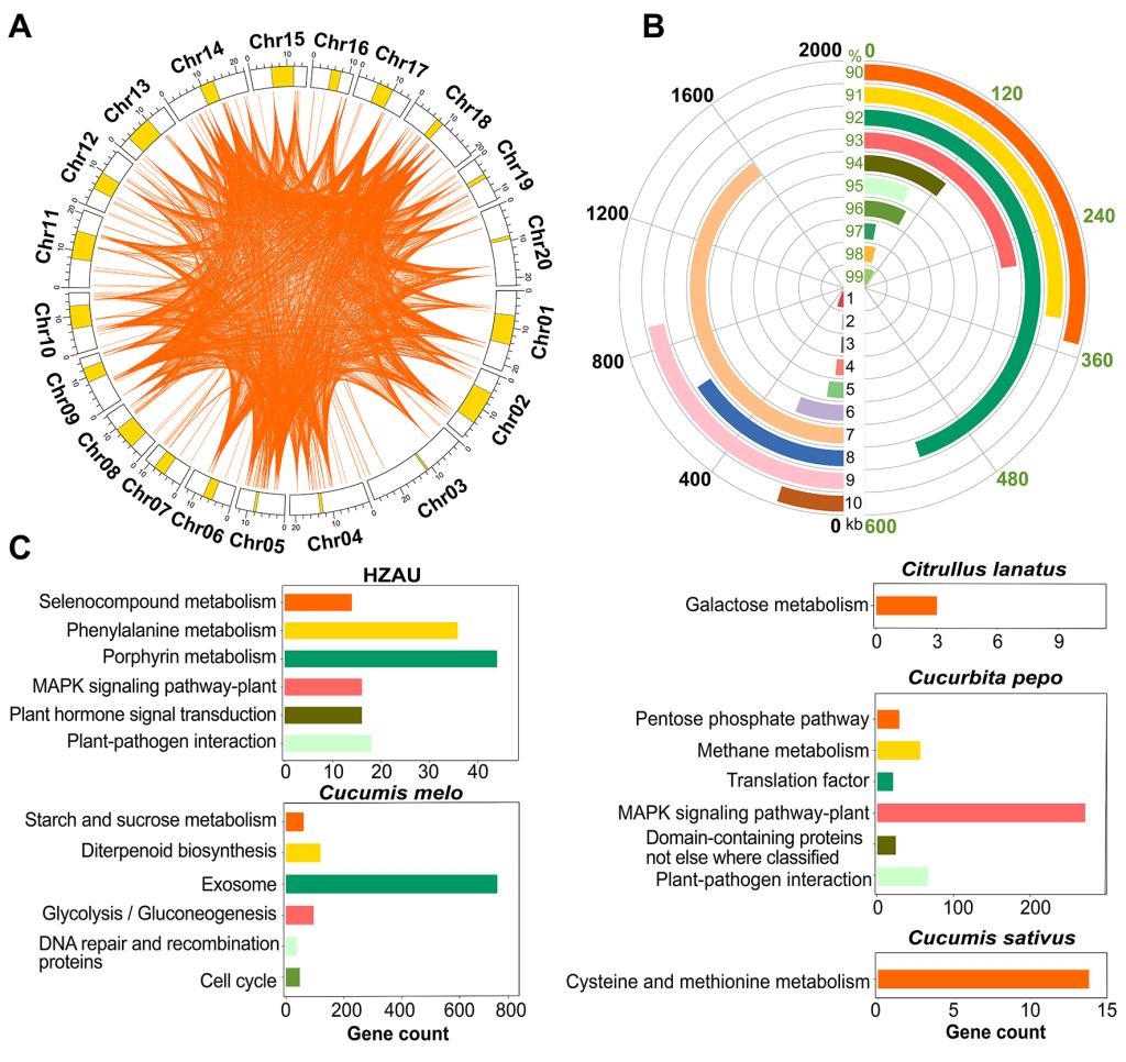 40个NLR基因,及28329个蛋白编码基因,其中27717个基因被功能注释,功能注释率高达97.84 %。此外,南瓜基因组中共鉴定了1984对片段重复(Segmental duplications,SDs),其中包含了139个拷贝基因。通过比较分析发现,在南瓜和葫芦科的其他属作物中,只有南瓜的SDs内的基因显著富集到了与抗病相关的通路,这也许是南瓜比葫芦科蔬菜作物具有更高抗逆性的原因。着丝粒是一个重要的基因组元件,在真核生物的染色体分离中起着至关重要的作用。该研究在每条染色体中都鉴定到了着丝粒区域,长度在0.54 Mb至9.05 Mb之间,平均长