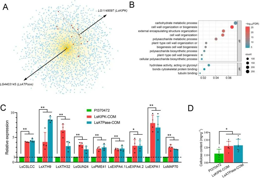 研究以莴笋和奶油生菜为亲本,在F₃代中鉴定到一个紧凑株型和散叶株型分离的家系。通过BSA RNA-Seq和图位克隆,鉴定到位于1号染色体上的LsKIPK基因,该基因外显子区域发生了一个无义突变,致使功能丢失。同时,从自然群体中发现该基因的激酶保守区域存在一种非同义突变,遗传互补实验验证了该变异类型也是一种功能丢失的等位基因型。然而,在结球生菜、罗马生菜和散叶生菜中,LsKIPK基因也存在这两种变异的等位基因型。这无法解释该基因对奶油生菜紧凑株型的充分性,暗示可能还有其他基因调控奶油生菜的紧凑株型。因此,以Lskipk突变基因型的奶油生菜和Lskipk突变基因型的结球生菜为亲本杂交,构建F₂分离群体。在F₂代群体发现非奶油生菜株型和奶油生菜紧凑株型呈现孟德尔遗传3:1的分离比,表明该群体中有一个新的奶油生菜紧凑株型遗传位点。通过BSA-RNA seq和图位克隆,鉴定到位于4号染色体上的LsATPase基因,该基因在第一个外显子存在19 bp序列的插入,导致基因功能丢失。从自然群体中也发现,该基因还存在第二种突变的等位基因型。至此,我们鉴定到调控奶油生菜紧凑株型的两个关键基因LsKIPK和LsATPase,证明了Lskipk Lsatpase双突变是奶油生菜紧凑株型的充分且必要的条件,并且两个基因的突变都是莴苣驯化后产生的。通过结球生菜和奶油生菜的转录组数据进行基因共表达分析,发现细胞壁合成通路与LsKIPK和LsATPase共处同一个调控网络,叶片背腹性基因表达与奶油生菜株型的形成没有必然相关性。通过表达量检测、显微观察和纤维素含量检测,表明LsKIPK和LsATPase通过调控细胞壁合成通路影响细胞壁的发育、细胞的大小和叶脉的发育,最终影响奶油生菜的株型。