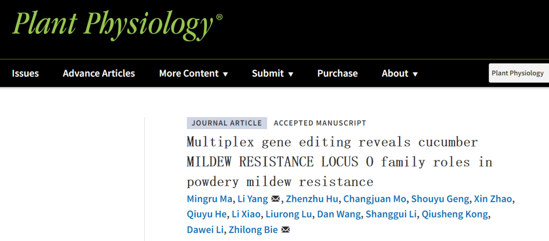 近日,华中农业大学别之龙教授/杨丽副教授团队在Plant Physiology在线发表了题为“Systemic analysis of cucumber MLO family by multiplex gene editing for engineering powdery mildew resistance”的研究论文。在瓜类作物中首次建立高效的多基因编辑体系,利用该体系靶向敲除黄瓜CsMLO基因家族13个成员,成功获得白粉病完全抗性黄瓜种质材料,并通过多组学联合分析解析了钙信号参与Csmlo1/8/11介导的黄瓜白粉病抗性分子机制。