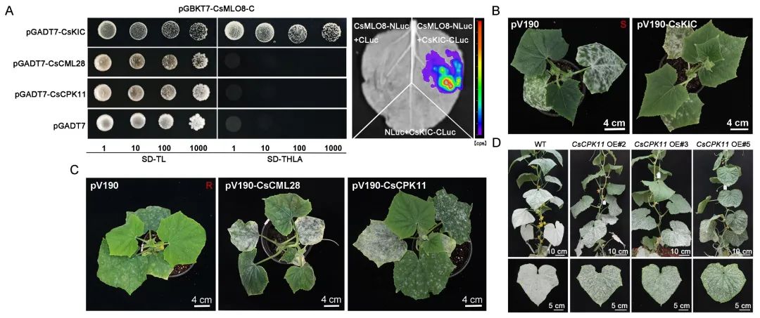 研究人员进一步基于所得不同抗病程度Csmlo突变体,采用高通量转录组与蛋白组关联分析,发现钙信号在Csmlo1/8/11介导的白粉病抗性中发挥着重要的调控作用。在Csmlo1/8/11突变体中,钙信号下游的三个基因CsKIC、CsCML28和CsCPK11的蛋白表达量显著升高。进一步研究发现,CsKIC与第V分支成员CsMLO1/8/11均存在蛋白互作。通过VIGS瞬时沉默CsKIC,能增强黄瓜白粉病抗病性,这表明与CsMLO8的功能一致,CsKIC是白粉病抗性的负调控因子,猜测CsKIC与CsMLO1/8/11互作协同参与白粉病菌入侵过程。另外,通过VIGS瞬时沉默CsCML28和CsCPK11,观察到黄瓜白粉病感病性增加;且二者分别与CsMLO1/8共沉默时,部分恢复了由于CsMLO1/8敲低而导致的白粉病抗性。这表明CsCML28和CsCPK11可能在CsMLO1/8的下游发挥正向调控作用,参与介导黄瓜白粉病抗性。最后,通过稳定遗传转化得到了CsCPK11过表达植株,与对照相比,其白粉病抗性显著增强。这些发现为深入理解Csmlo介导的黄瓜白粉病抗性机制提供了关键线索。