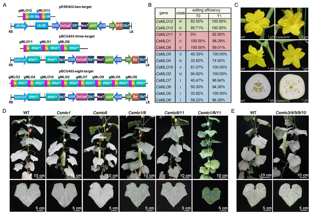 该研究首先采用II型启动子cestrum yellow leaf curling virus (CmYLCV) 驱动由tRNAGly 间隔串联的多个sgRNA,建立了一个高效的黄瓜多基因编辑系统。利用该系统,以易感白粉病的华南型黄瓜CU2种质为受体,对CsMLO基因家族13个成员进行了多基因编辑,获得了一系列Csmlo单、多突变体。进一步,对这些突变体的白粉病抗性和生长表型进行了系统调查。研究发现敲除CsMLO家族第V分支三个基因CsMLO1/8/11,所得单突变体Csmlo8仍然易感白粉病,所得双突变体表现为中等白粉病抗性,尤其值得关注的是同时编辑这三个基因的黄瓜三突变体材料Csmlo1/8/11获得了白粉病完全抗性。然而,并未观察到五突变体Csmlo3/4/5/9/10白粉病抗性的改变。此外,对多个Csmlo突变体生长表型进行系统观察还发现,相较于对照为五瓣花和三心室果实,Csmlo3/10突变体中黄瓜六瓣花、七瓣花的数目显著增多,其四心室果实的比例也大幅提高。这是首次在植物中报道CsMLO家族Ⅱ分支成员的功能。而Csmlo12/13突变则导致雄性不育且叶面积增大的表型。因此,通过对CsMLO家族基因进行多基因编辑,成功获得了白粉病完全抗性黄瓜材料;对家族突变体白粉病抗性和生长发育表型的系统调查,为利用Csmlo进行黄瓜白粉病抗性育种提供了重要的理论依据。