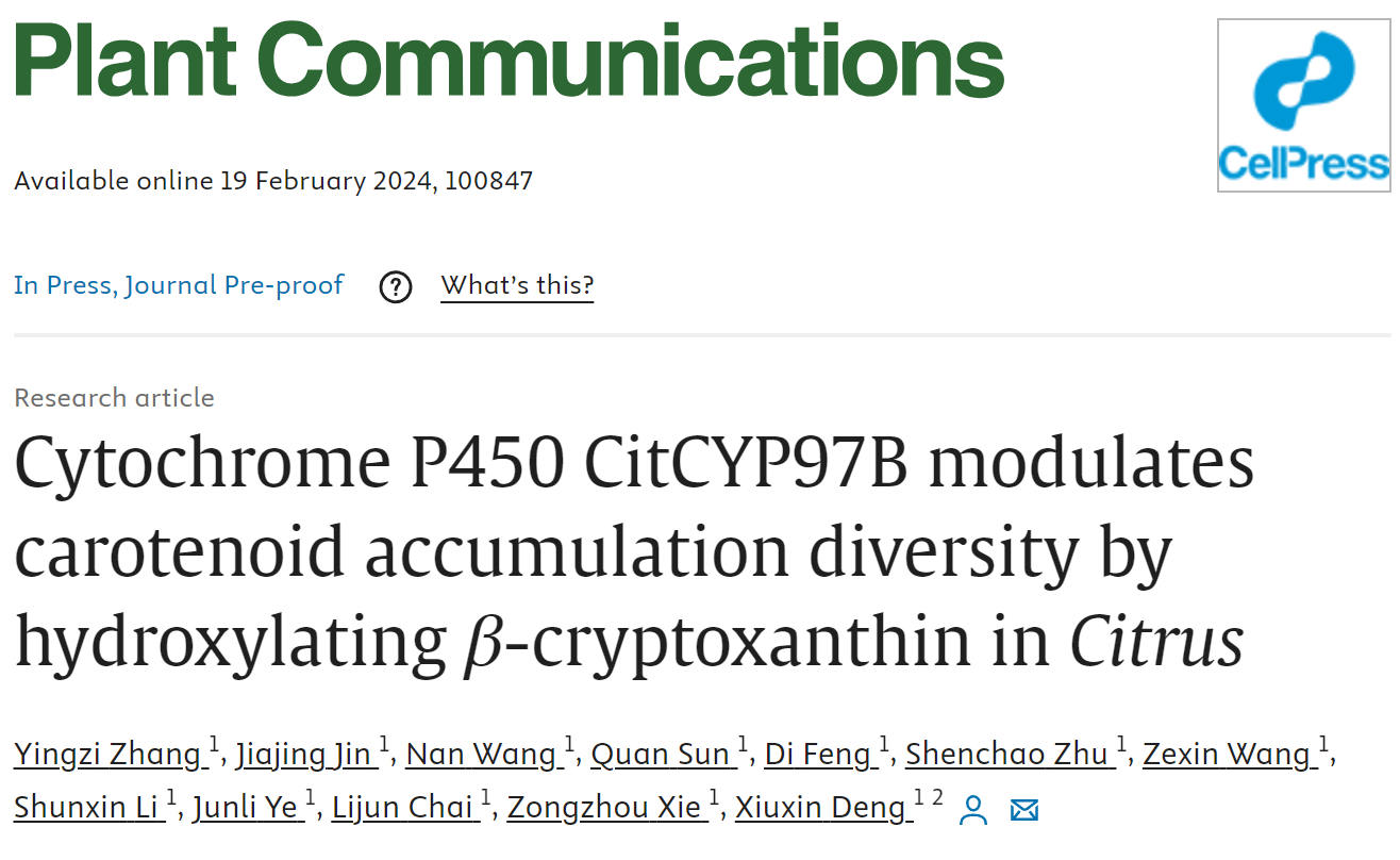 近日,果蔬园艺作物种质创新与利用全国重点实验室/湖北洪山实验室、我校八八看球 邓秀新院士团队在Plant Communications在线发表了题为“Cytochrome P450 CitCYP97B modulates carotenoid accumulation diversity by hydroxylatingβ-cryptoxanthin inCitrus”的研究论文。该研究综合基因组、代谢组和基因功能研究手段定位并验证了柑橘细胞色素P450蛋白CitCYP97B通过羟化β-隐黄质参与影响柑橘果实类胡萝卜素的差异积累,拓展了植物类胡萝卜素合成代谢的认识,为柑橘果实以及其他作物色泽品质和营养品质改良提供了重要依据。