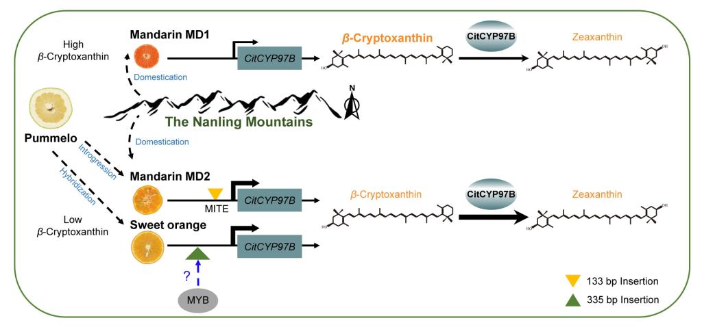 在此基础上,研究人员进一步探究了柑橘自然群体CitCYP97B序列变异与β-隐黄质差异积累间的联系。研究发现柑橘CitCYP97B启动子主要划分为7种单倍型。其中,相较于野生宽皮柑橘、南岭以北的宽皮柑橘(MD1)和柚类,南岭以南的宽皮柑橘群体(MD2)携带133bp的结构变异(Hap.4),甜橙携带335bp的结构变异(Hap.5),呈现类群特异性分布的特征。烟草双荧光素酶实验结果表明,携带结构变异的单倍型Hap.4和Hap.5启动子活性显著增强,与宽皮柑橘MD2和甜橙果实中更高的基因表达水平以及更低的β-隐黄质积累水平相吻合。为深入了解CitCYP97B启动子序列多态性的进化机制,研究人员评估了柑橘各群体的遗传多样性、群体分化系数以及基因渗入事件,推测CitCYP97B多态性与柑橘演化进程中的种间杂交和基因渗入有关,并提出了一个由CitCYP97B介导的影响柑橘果实β-隐黄质差异积累的模型。