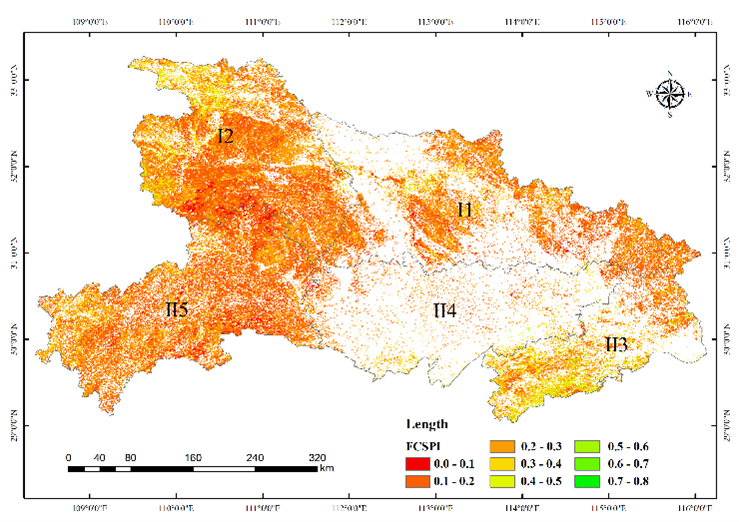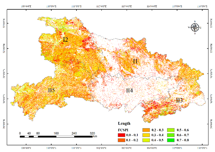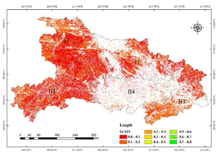 在第8次(2009-2013年)森林调查中,森林碳汇潜力指数(FCSPI)的在不同植被带的空间分布图中,I1代表大别山桐柏山低山丘陵植被区,I2代表鄂西北山地丘陵植被区,II3代表鄂东南低山丘陵植被区,II4代表江汉平原湖泊植被区,II5代表鄂西南山地植被区。地图中已排除无森林覆盖的区域。