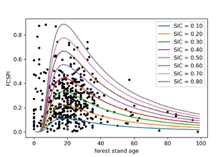 森林碳汇潜力指数依据逻辑斯蒂模型,通过460个国家森林持续清查(NFCI)样地数据构建了林分尺度的碳汇潜力指数;进一步考虑气候、地形和土壤变量对森林碳汇的影响,利用随机森林(RF)构建了空间连续分布的碳汇立地指数(SIC)模型;最后结合生长过程模型,从而预测整个北亚热带的FCSPI。经检验,该指数的R2值可达0.78。