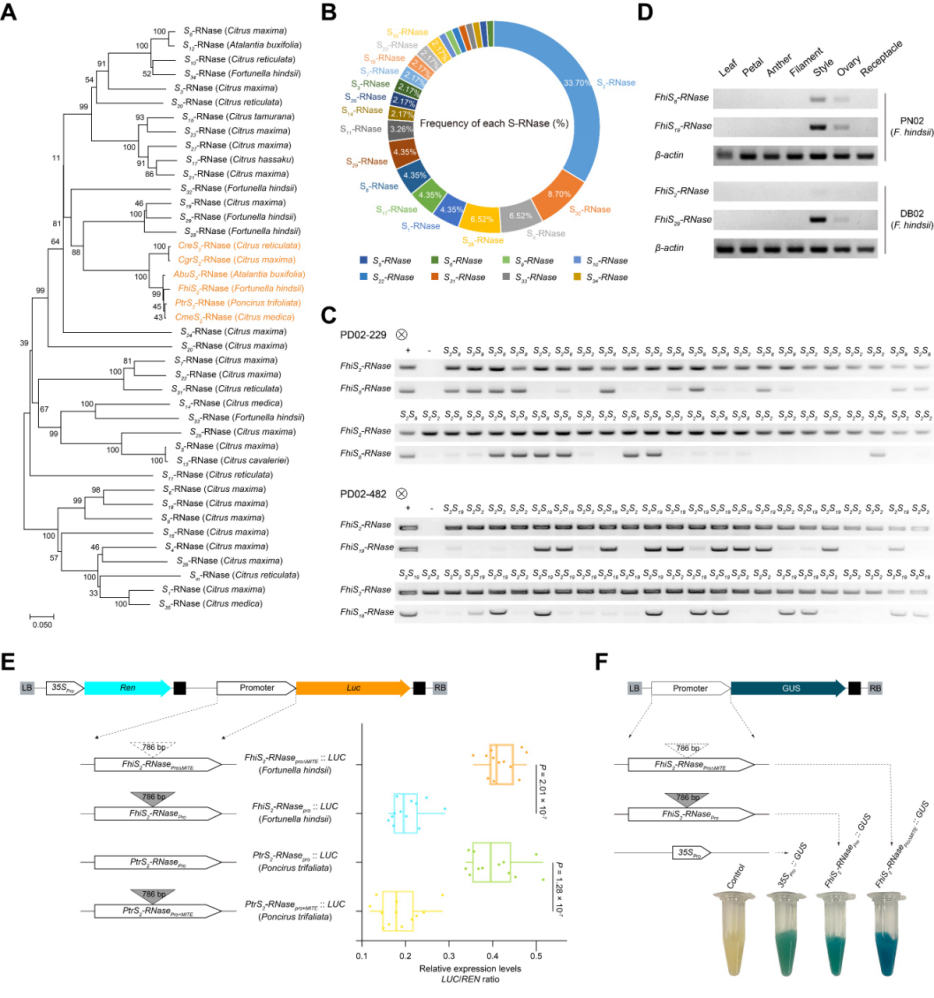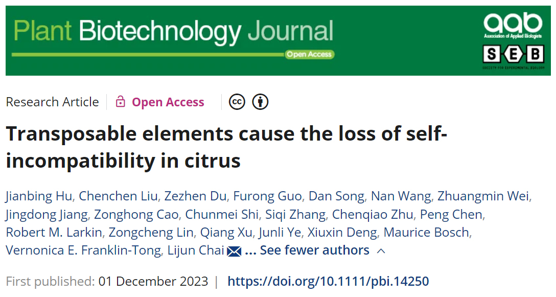 近日,国际植物学期刊Plant Biotechnology Journal在线发表了华中农业大学果蔬园艺作物种质创新与利用全国重点实验室/洪山实验室邓秀新院士团队柴利军教授组题为“Transposable elements cause the loss of self-incompatibility in citrus”的学术论文。研究系统证实控制自交不亲和S位点中S-RNase启动子附近MITE转座子的插入导致了芸香科金柑属(Fortunella)植物自交不亲和性状的丢失,且转座子插入事件在S-RNase介导的植物自交不亲和系统中具有广谱性,拓展了人们对植物自交不亲和向自交亲和性转变机制的新认识,建立了金柑属植物苗期分子标记辅助快速鉴定亲和性状技术体系,为柑橘种质创新与新品种培育提供了新思路,具有重要的理论及应用价值。