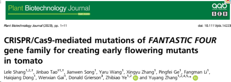 近日,华中农业大学园艺作物种质创新与利用全国重点实验室番茄课题组在Plant Biotechnology Journal发表了题为“CRISPR/Cas9-mediated mutations of FANTASTIC FOUR gene family for creating early flowering mutants in tomato”的研究论文。