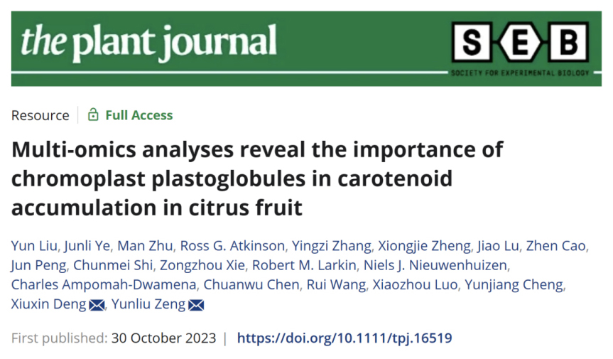 柑橘是全球和我国最重要的果树之一,2022年我国柑橘种植面积超过4500万亩,产量超过6000万吨,在国民经济发展和乡村振兴事业中发挥重要作用。柑橘色泽种质资源丰富,选育色泽多样的优质品种是柑橘育种的重要方向。然而,部分品种色泽不稳定导致商品性不佳。因此,探讨类胡萝卜素稳定储存的细胞器及其控制基因至关重要。