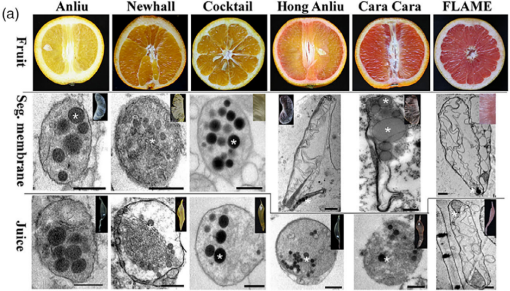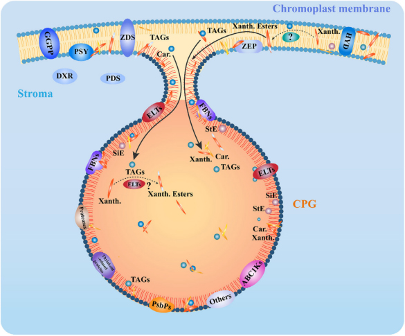 近日,华中农业大学果蔬园艺作物种质创新与利用全国重点实验室邓秀新教授和曾云流副教授课题组在Plant Journal发表了“Multi-omics analyses reveal the importance of chromoplast plastoglobules in carotenoid accumulation in citrus fruit”的研究论文,本文发现柑橘果肉有色体主要有晶状有色体(特异积累番茄红素和β-胡萝卜素)和球状有色体(特异积累β链类胡萝卜素)两种类型组成,其中球状有色体中质体小球的形成与β链类胡萝卜素积累相关,并稳定储存于果实中(图1)。