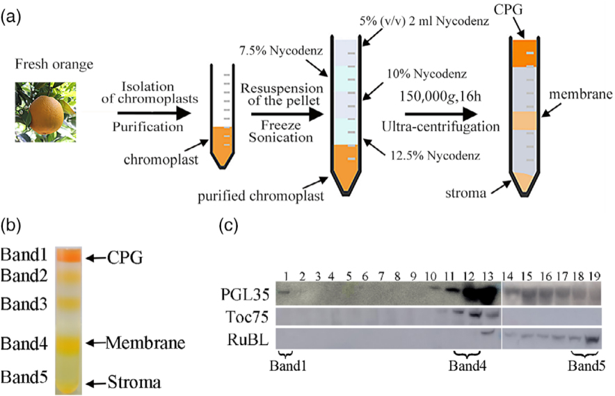 之后,在柑橘有色体纯化的基础上,利用密度梯度离心方法建立了有色体质体小球的分离提纯方法(图2);利用比较蛋白质组学与比较脂质组学构建了质体小球定位蛋白网络和质体小球脂质谱(图3)。