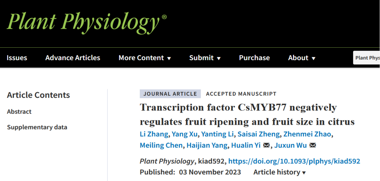 近日,华中农业大学果蔬园艺作物种质创新与利用全国重点实验室伊华林/吴巨勋老师课题组在Plant Physiology发表了“Transcription factor CsMYB77 negatively regulates fruit ripening and fruit size in citrus”的研究论文,揭示了转录因子CsMYB77通过调控SINAT4和PIN5分别参与脱落酸(ABA)和生长素信号通路的调控,从而实现负调控柑橘果实成熟和果实大小的分子机制。
