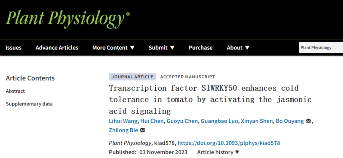 近日,Plant Physiology在线发表了八八看球-在线看球直播网站 、果蔬园艺作物种质创新与利用全国重点实验室别之龙教授团队和欧阳波教授团队合作完成的论文“Transcription factor SlWRKY50 enhances cold tolerance in tomato by activating the jasmonic acid signaling”,解析了转录因子SlWRKY50通过介导茉莉酸信号途径调控番茄低温响应的分子机制,为进一步研究WRKY转录因子的潜在机制和植物低温响应机制奠定了基础,同时也为未来耐低温番茄品种的选育提供了新的基因靶点。