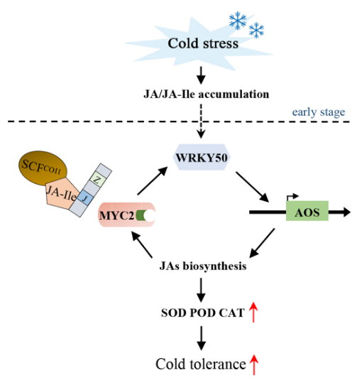 番茄是一种对冷害极为敏感的喜温蔬菜,如何增强番茄植株耐冷性对于冬春季番茄设施栽培具有重要意义。课题组前期发现以野生型多毛番茄作为砧木嫁接栽培番茄能提高其耐冷性,茉莉酸在多毛番茄嫁接增强栽培番茄耐冷性中具有重要作用(研究结果已发表在Horticulture Research//doi.org/10.1093/hr/uhac227),但其中具体调控茉莉酸生物合成的作用机制尚未明确。