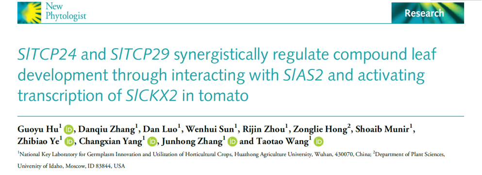 近日,华中农业大学番茄团队王涛涛、张俊红教授课题组在国际权威学术期刊《New Phytologist》发表了题为《SlTCP24andSlTCP29synergistically regulate compound leaf development through interacting withSlAS2and activating transcription ofSlCKX2in tomato》的研究论文。TCP转录因子在调控植物的叶片发育过程中起着重要作用,研究发现SlTCP24和SlTCP29共同调控番茄复叶发育,是番茄复叶发育的负调控因子,当两个基因同时被敲除时,叶片的小叶数显著增加,叶型更加复杂。