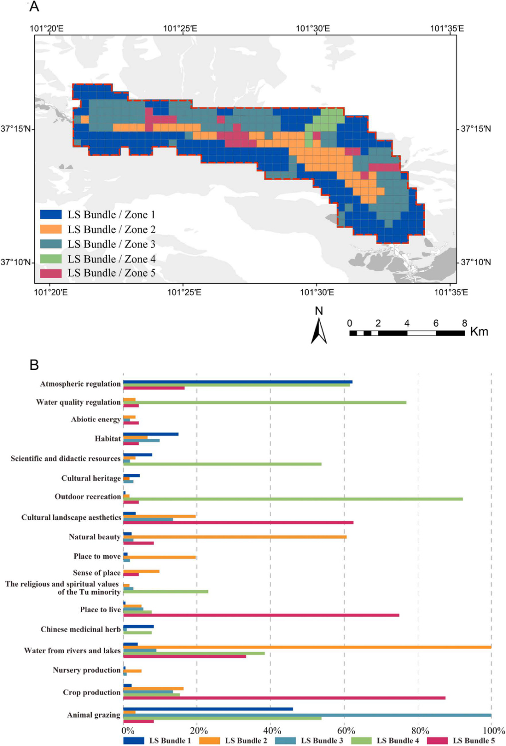 图3 每个地景服务簇类型(分区)的空间分布(A)。柱状图显示每个簇中分布的地景服务服务的比例,其中0%-100%代表簇中包含特定地景服务的网格数量占该簇所有网格数量的比例(B)。