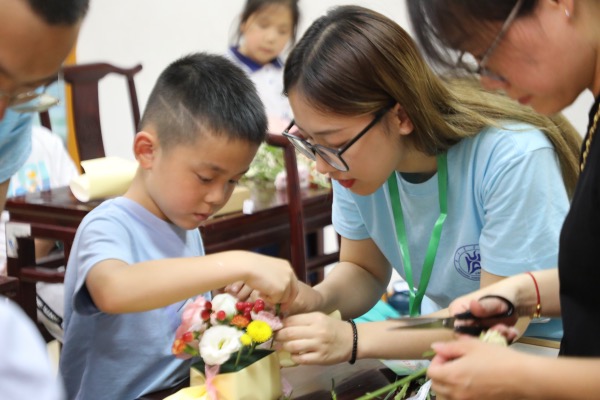 这个暑假,来自华中农业大学的志愿者们摩拳擦掌,携手宁波市奉化区青少年宫开展了“流动青少年宫”少儿花艺体验进社区活动。该活动分两天在奉化区绿都社区、锦屏街道西岸村和丹营服饰等三个社区进行。