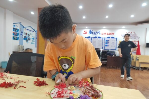 首先,志愿者何欣欣简单讲解了中式团扇的装裱特点以及干花拼贴的小技巧,接着志愿者们为小朋友分发干花,团扇,胶水等工具。小朋友们挑选出自己喜欢的干花材料包,在团扇上摆上各式各样的形状,扇面上的干花与绿叶错落有致、相互映衬,一个个独具创意、色彩斑斓的团扇作品制作完成。小朋友们或举起欣赏、或轻扇体验、或交谈分享,现场气氛持续高涨。
