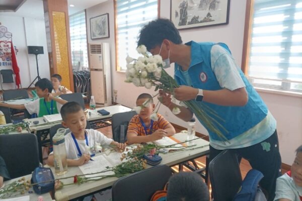 为积极推动构建美育第二课堂,7月7日上午十点,张瑜服务队赴硚口区学堂社区面向社区孩童开展了以“万物有灵,探询花道”为主题的花艺科普实践课程,36位小朋友共上一堂芳香四溢、色彩斑斓的插花课。