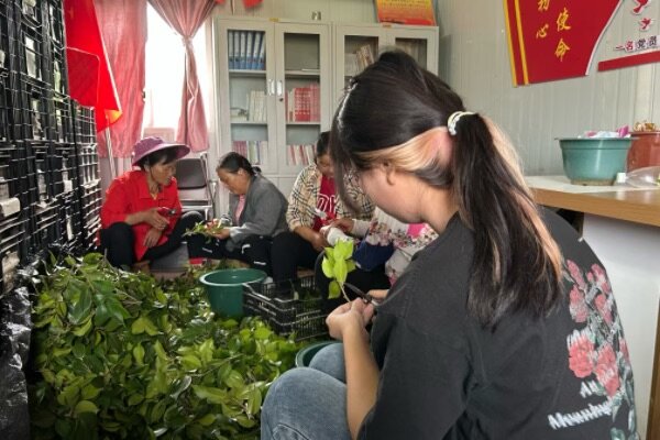 下午,实践团队参与了春之染种植合作社与武汉市农科院合作的茶花扦插枝条制备工作。在这个过程中,团队的成员们认真学习,虚心请教,并在工作人员的指导下明白了修剪枝条的重点在于处理芽点。芽点主要位于新枝和老枝之间,并且相对于枝条其他部分更加隆起。芽点部位更容易生根,因此需要保留此部分以保证枝条生根存活。修剪时,他们斜切芽点并除去大部分叶子,只保留顶端裁剪过一半的叶片。处理好的枝条被捆扎成束后,斜切部分会浸泡在溶有生根粉的乙醇溶液中消毒,然后放置在阴凉处等待扦插。经过团队成员的努力,茶花扦插枝条的制备工作圆满结束,工作人员对他们的成果给予了赞赏。