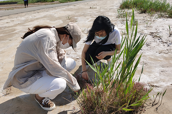 7月31日,刘子涵来到了黄河入海口进行实践调研。黄河入海口位于山东省东营市垦利区黄河口镇境内,拥有中国最完整、最广阔、最丰富的湿地生态系统,有著名的黄河三角洲国家级自然保护区,被誉为鸟类的天堂。她参观了黄河三角洲国家级自然保护区的鸟岛、泥滩捉蟹、黄河入海口等风景区,了解了该地的土地盐碱化情况和湿地生态环境保护情况,辨识了柽柳、碱蓬、芦苇等适应该地区环境的植物。