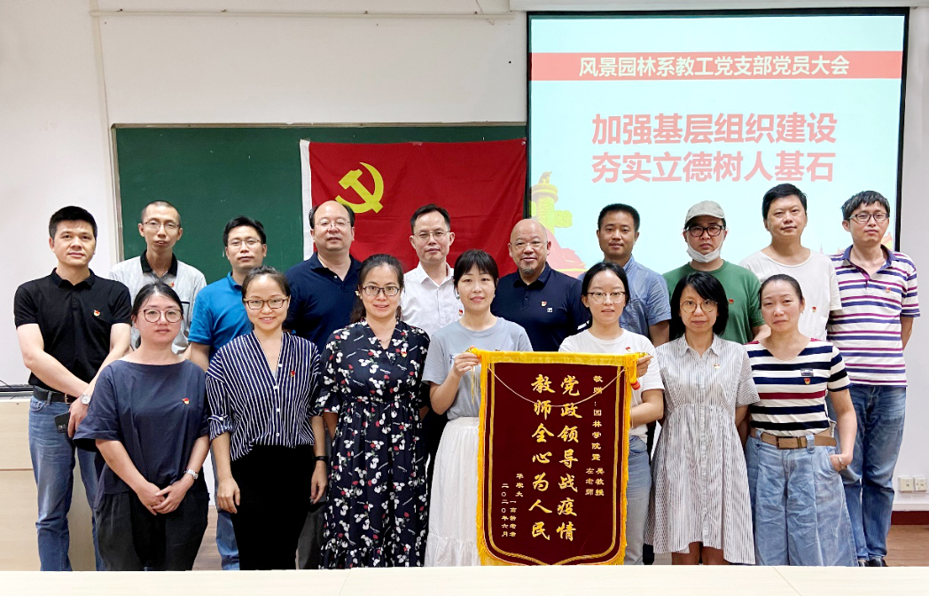 活动最后,与会同志在党旗下合影留念。照片的中央是我校一名老教师当日上午赠送八八看球 及风景园林系吴雪飞老师的锦旗,其上赠言“党政领导战疫情,教师全心为人民”。