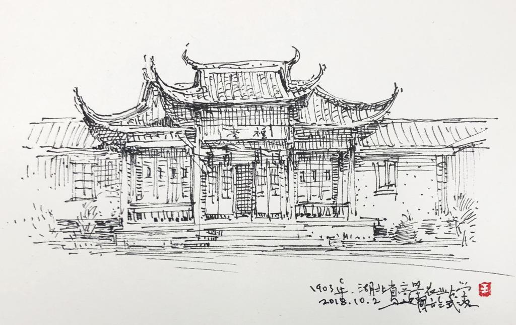 报告结束后,与会代表和学子积极提问、参与讨论。为誌记华农建校120周年,王建国院士还特别绘制了湖北省高等农务学堂礼堂速写,作为礼物赠送我校。