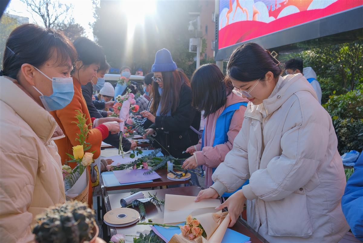 洋桔梗、奶油小菊、黄玫、康乃馨,经修剪、组合和包装,变成一束束美丽的手捧花。12月4日,在武汉市洪山区狮子山街道玫瑰湾社区广场上,华中农业大学本禹志愿服务队分队张瑜服务队的志愿者们开展志愿服务活动,手把手地教居民们做手捧花。