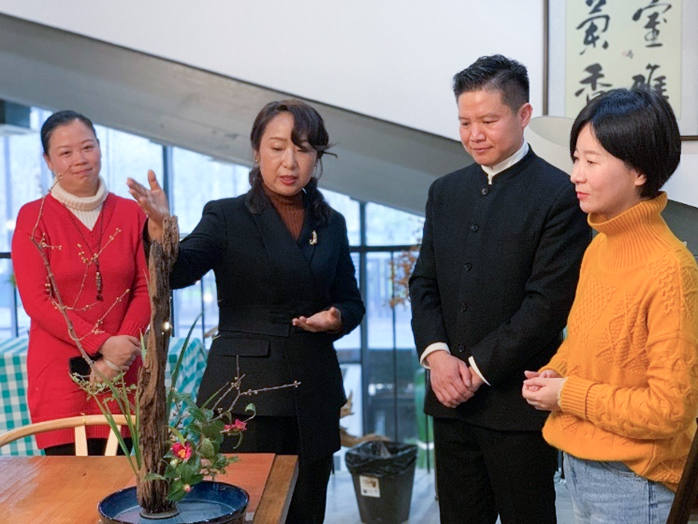 小寒篇“姹紫嫣红花园里”活动现场设在汉阳五境花园董事长孙艳霞董事长的五境花园。八八看球-在线看球直播网站 张蔚副教授作为嘉宾主持,带领花友们一边游览空间室外花境冬季景色。孙艳霞向花友们介绍了五境花园的创立初心——综合性的沉浸体验。宾客可以进行多彩多姿的体验活动如插花、花艺、绿植组合设计以及美食、读书会和抚琴等。活动结尾,五境花园特邀梁朋花艺师应小寒节气现场创作中国传统插花,利用枯荣相生的自然理念,以枯木、蜡梅枝、茶花等表现小寒的“三侯”意象,也表达对于自然与生活深层次意境的追求。