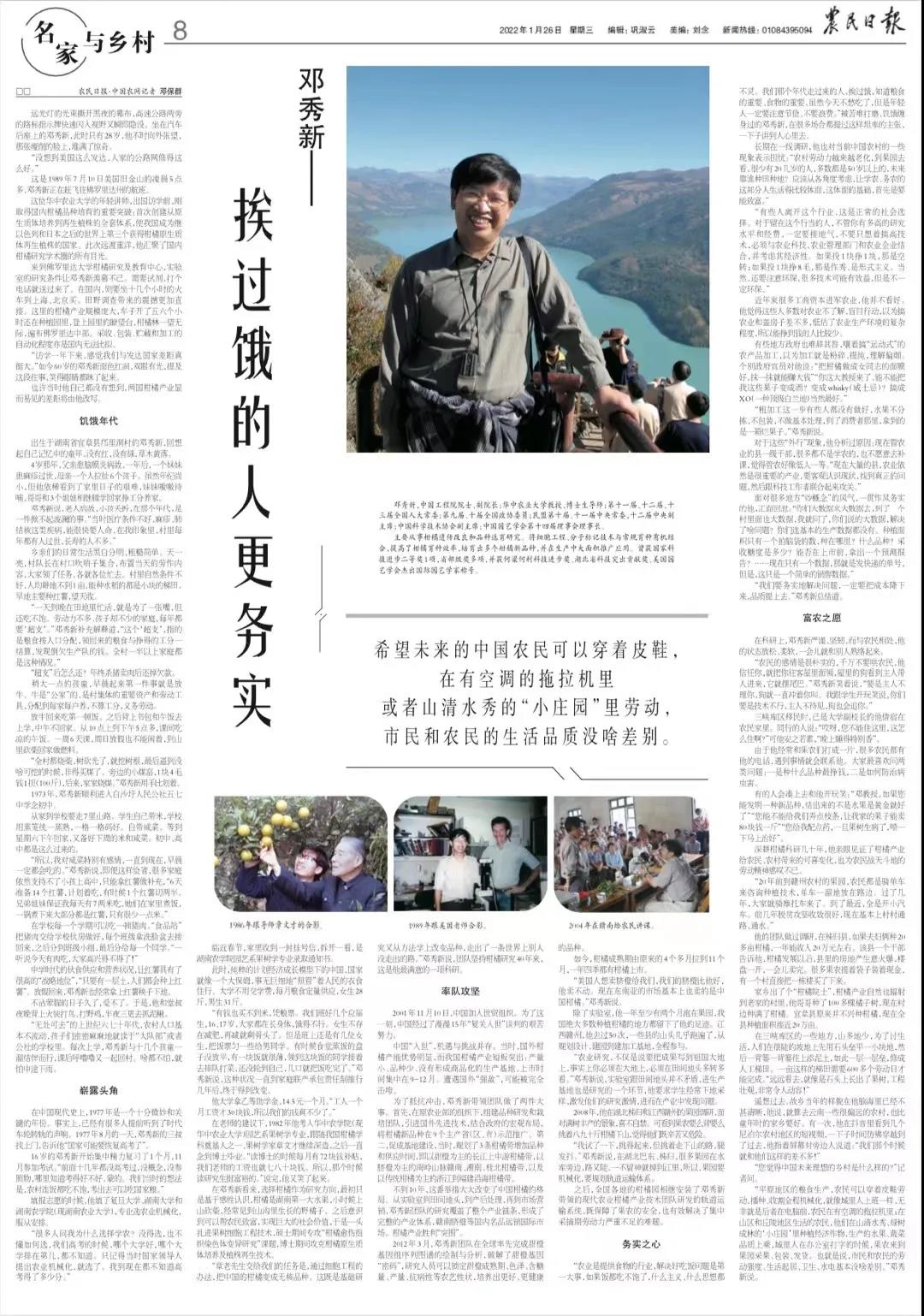 “农业研究,不仅是说要把成果写到祖国大地上,事实上你必须在大地上,必须在田间地头多转多看。”邓秀新说,实验室跟田间地头并不矛盾,进生产基地也是研究的一个环节,他要求学生经常下地采样,激发他们的研究激情,进而在产业中发现问题。