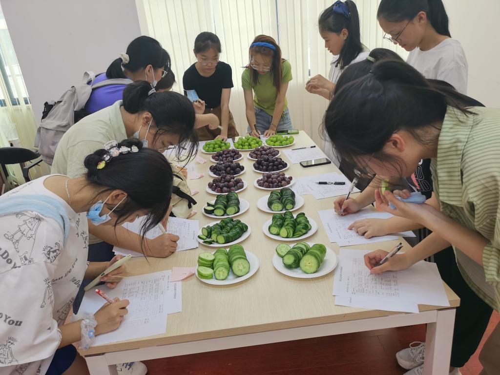 同学们首先品鉴了三种不同品种的黄瓜,同学们从外观、种子数量、气味、滋味、质地五方面对三个不同品种的黄瓜展开感官鉴赏。黄瓜鉴赏结束后,同学们又品鉴了四种不同品种的葡萄,从外观、食用便利性、气味、滋味、质地五方面对葡萄展开了感官鉴赏,同学们兴致盎然,认真品鉴并填写感官鉴赏评价表。