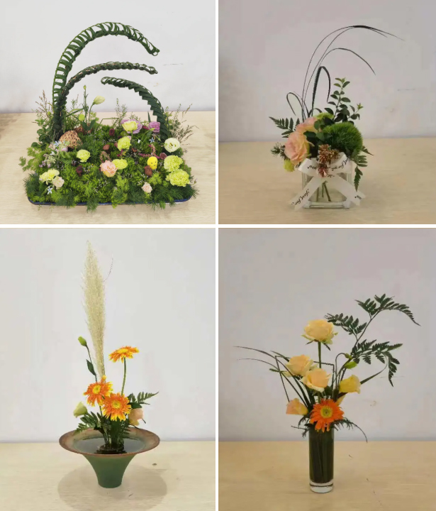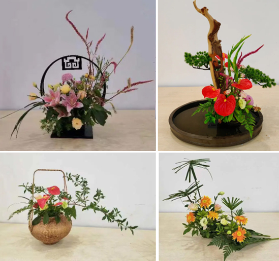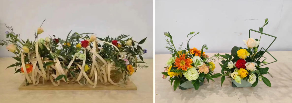 为献上中秋节和教师节祝福,王彩云老师和老师同学们还现场创作了《花好月圆》。借由圆形框景,搭配象征美满阖和的百合花作为主花材,加以秋季特色花材鸡冠花,饱满的轮廓与花材明亮和谐的色彩传递出花好月圆人长久的祝福。在此中秋佳节之际,祝福每个家庭健康、团圆、美满。《松鹤延年》以象征长寿的崖柏老人雕刻为主干,配仙鹤起舞的象形唐菖蒲花枝和松枝、红掌等祝愿老人们健康长寿。《全心育人》以红掌、栀子表达教育者兢兢业业、辛勤育人的一片赤诚之心,并以此作品向各位老师致以崇高的敬意。研究生新生邓楠同学创作的《烟雨行舟》运用娴熟的编织技法将散尾葵编织成一尾小舟作为异形容器,修剪的旱伞草象征南方传统的防雨保暖蓑衣,用亮丽的橙色非洲菊为焦点花,栩栩如生地表达学生不忘初心,砥砺前行的信念,其新颖的构思和技法收获了参观者的一致好评。周欣老师和邓楠、刘星雨、吴琳、甘奇玉等同学还创作了表达白露节气文化的现代花艺架构作品《凝露为秋》以其现代新颖的架构造型和清新的色彩吸引着参观者的目光;还有生活小品插花表达《欢庆双节》。