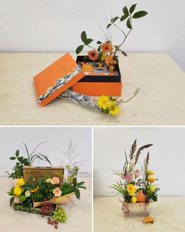 王彩云老师与学生们共同创作的《橙里月光》、《春华秋实》与《菊黄蟹肥》,巧妙地利用了学校的月饼礼盒、茶具礼盒等日常包装礼盒插花。其中《橙里月光》以礼盒的橘色为基调,配以橙黄色系的非洲菊、金鸡菊,展现金秋硕果累累、温暖祥和的气氛。《春华秋实》中以园林系老师研究的月季、康乃馨、桂花、兰花和观赏草为背景枝、花材和叶材,将美味葡萄串点缀其中,花朵和果实交相搭配,勾勒出春花秋实的美好图景。《菊黄蟹肥》中运用成熟度不同、色彩渐变的高粱穗、旱伞草和黄色乒乓菊、月季、橙黄色的螃蟹壳与编织篮,表现武汉大江大湖秋吃螃蟹赏菊的美景,流露出浓浓的农家丰收季喜悦与期盼。