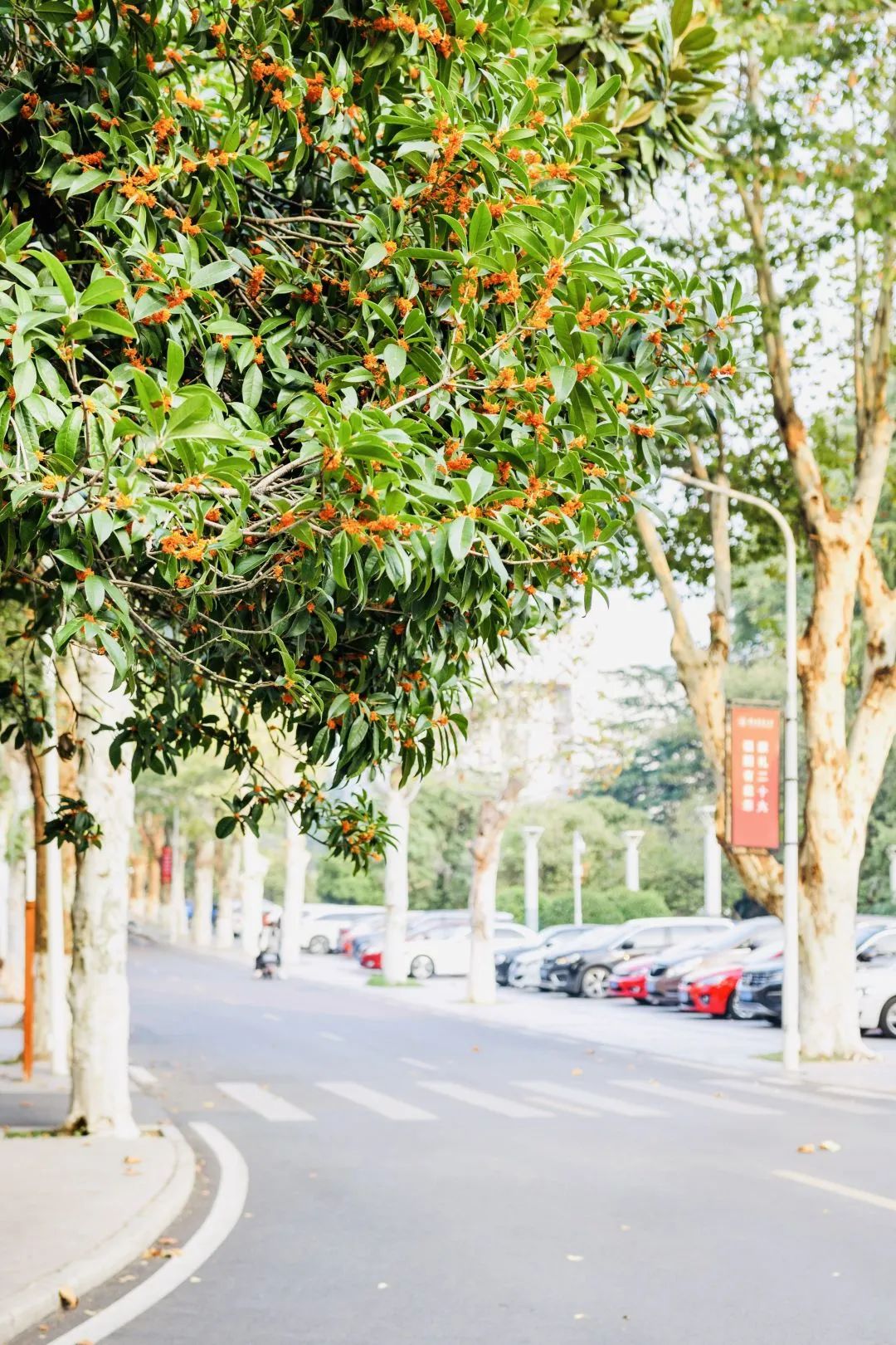 桂花根据花期可以分为秋桂和四季桂,根据颜色可以分为丹桂、金桂、银桂,在华中农业大学校园内,大多为圆叶四季桂这一品种,在丹桂路、北苑等区域,则种有大量金桂和部分丹桂。
