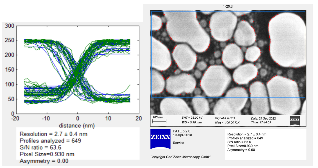 图注:金标样品观察,测得高真空二次电子分辨率2.7nm