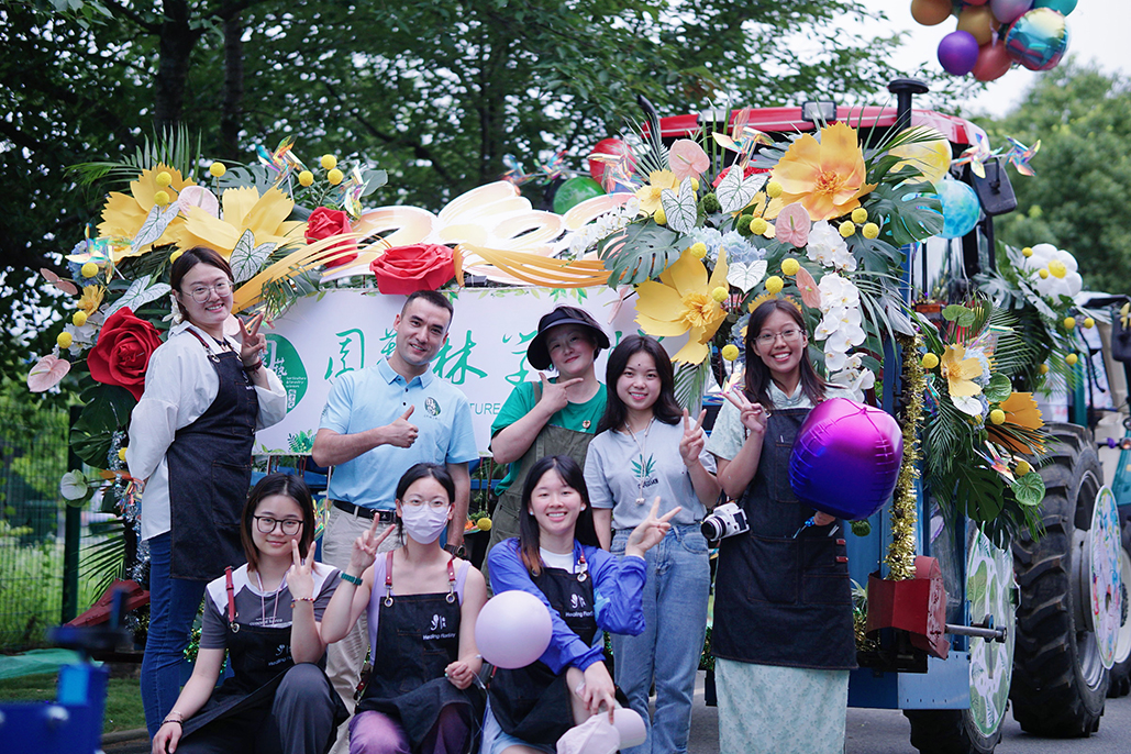 铁机龙舟,踏歌而行。园林院花车整体花团锦簇,校花大金鸡菊代表着同学不畏艰苦困境的精神,每一位园林人又有着玫瑰的热烈与浪漫,用无悔的青春创造着美好生活!狮山风响,风动花香,香培玉琢,玉汝于成!花车内蔬果飘香象征着园林院学术上的磊磊硕果也为毕业生们献上收获的喜悦,森林、园林,林下风致;果树、花蔬,书声琅琅;设施,茶事,事事关心,车轮滚滚,四季轮回,六月蝴蝶,群芳盛开。鲜花构筑起车的骨架代表了毕业生四年来朵朵珍贵的回忆,车后巨大的蝴蝶结与气球束将大家拉回夏日的童年,希望大家千帆过尽,归来仍是少年!保留一份青春的纯真与好奇。巡游方阵气球上展示了园林院所有本科毕业生的毕业论文题目希望同学们以此为起点,在未来继续努力创造美好,有花有果,春华秋实,四年之期已满,丰收之时已至。看园里,林荫已茂,茶韵远飘;观棚内,繁花怒放,瓜果留香,园林人用自己的方式发现美好创造美好。