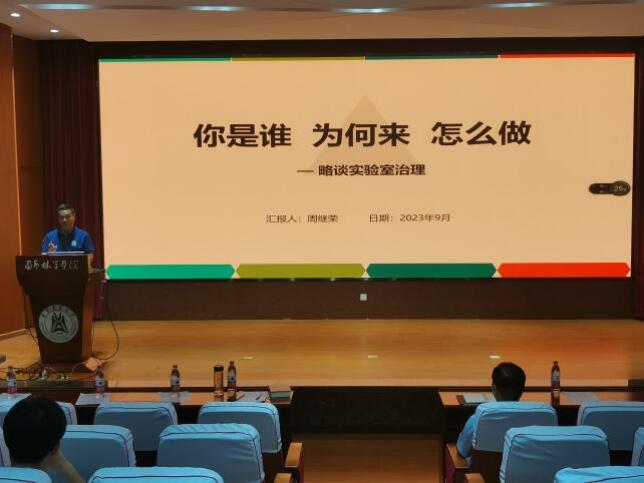 会议伊始,周继荣副院长从“你是谁,为何来,怎么做”三个方面来展开讲述,强调同学们要经常去思考,要去勤学苦练、强健体魄、接受教化(尤其是实验室治理体系)、守正创新。接着讲述了实验室治理的三重境界:第一个是法,表示八八看球 会对实验室、自习室、基地进行依法治理;第二个是德,表示要以德化人;三是道,表示要将安全管理融入生活方式,融入师生品格。