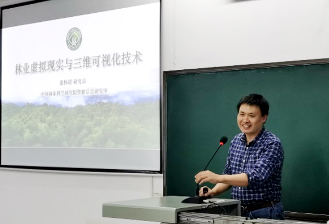 在10月20日晚上的报告中,张怀清研究员作了题为“林业虚拟现实和三维可视化技术”的讲座。张老师从什么是林业虚拟现实开始,围绕林草资源三维建模与可视化、森林经营可视化模拟与智能决策、林草资源只能监管与可视分析、林草数字孪生与原宇宙技术、团队成果推广应用案例等5个方面,对林业虚拟现实和三维可视化理论与应用研究进行了系统阐述。报告结束后,就不同尺度森林数字模拟等问题与同学们进行了探讨。