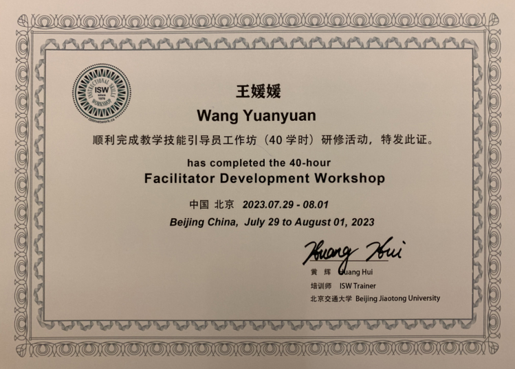 FDW引导员工作坊是ISW的进阶培训,旨在培养教学技能工作坊的引导员。参训教师在培训师的指导下,通过主题学习、微格教学、反馈和引导实践等环节,深入了解BOPPPS教学设计以及工作坊引导技巧与理念。获得FDW证书的教师将具备组织和引导工作坊的能力,为其他教师提供指导和支持。园林系王媛媛老师参加清华大学组织的培训班,获得了FDW(Facilitator Development Workshop)引导员工作坊培训证书,她表示“会将所学的知识和技能应用到教学实践中,并积极探索新的教学方法和手段;通过开展教学研究、参加教育研讨会等方式,与同行交流和分享经验,推动教学改革和创新;运用所学本领组织各种主题的培训活动,帮助其他教师提高教学技能和专业知识。”